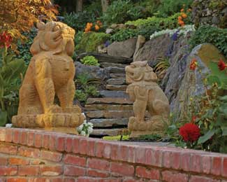 The project called for Tudor formality rapidly transitioning to native forest. Carefully arranged plant selections and gracious furnishings provided formality near the house. Rustic furnishings and informal plantings transition from the formal areas to the surrounding trees and rock formations. Touches of the tropics were added by using plantings of hot colors and installing Chinese lions (Ra shi da), traditionally used as mythic protectors of imperial palaces.