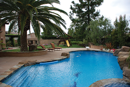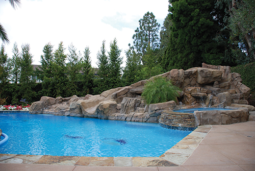 While a standard cement-lined swimming pool can be fun, it is nothing compared to the enjoyment that comes from a rockslide pool. Land Mechanics tore out the existing pool and spa and replaced it with a custom rock pool with integrated slide. The pool, as well as the pad for the fire bowls, was made with pre-cast concrete. And the newly raised spa features a natural spillway. Natural stone replaces the boring concrete, and for ease of operation, an integrated wireless Jandy control system was included. This Jandy unit remotely controls the pool, the gazebo DVD player, cable TV and the outdoor lighting systems. The contractor installed 75 custom-manufactured low-voltage, solid brass fixtures to light up the back yard.