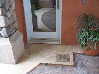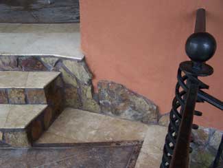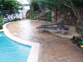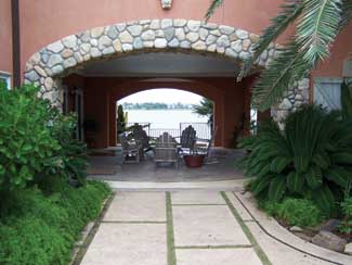 The Porte-cochere was designed to serve two purposes: one, to allow shelter from the rain and two, to become a true extension of the home. As you proceed into the breezeway, the paving of the motor court ends and the more delicate, personal scale begins. To tie the paving together, the same color and stamp from the motor court was used in the center, though it was saw-cut in a nice diagonal, diamond shape. This was then banded with a deep, red, two-inch burgundy marble and a lighter natural Marbella stone. Landesign felt that extending this breezeway and stepping it down would create a secondary, more intimate sitting area. This created a focal point for the breezeway and allows for a maximum viewing of Clear Lake. From here, when you step down to the left, you enter the mid-level Bocce Ball Court. When walking to the right, you are lead down to the pool area. The landscape design used here called for a mixture of the stamped concrete and natural stone tiles to tie and unify the various site elements together. In addition, this allowed us as to introduce rustic “Moss Rock” foundation pieces into the project.