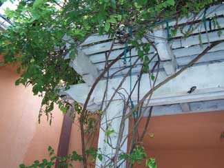 One significant challenge was to minimize the impact of a shared motor court with the major entrances to the home. We designed 3’ x 6’ individual colored, salted and textured concrete panels, separated with a three inch band of grass surrounding each panel. The rock salt thrown on the concrete at the final trowling adds additional texture, age and character. This solution created a uniquely wonderful arrival experience for the grand stairway, and clearly established an axis for the whole home through to the porte-cochere, while providing access to the garage as well. To soften and screen the garage doors while allowing us to maintain our Italian Villa feel, we designed a large cedar beam arbor that was built to espalier Bougainvillea & Wisteria vines.