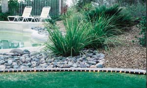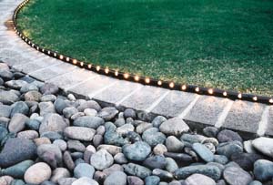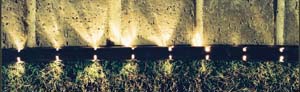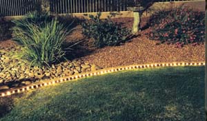 The Light Rope was fed through each succeeding section, one at a time, as it was placed in the trench. Every 30 feet we reconnected to our trunkline and tested the lights before proceeding with the install. The edging was anchored by placing one 11 gauge "J" stake at the center of a 5 foot section and one over adjoining pieces (two sections of edging butted together). Once driven into the ground the underside of the "J" rests over the top of the edging firmly securing it in position. When the project was completed the result was an aesthetically pleasing, lighted border which accented scenery previously lost at nightfall.