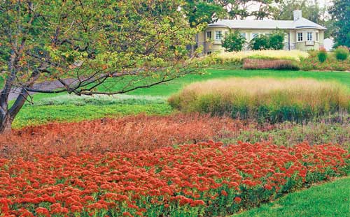 Tufted grasses soften lines and create focal points between the Cottages at Water’s Edge, a new community of vacation homes. Ornamental grasses move with the wind and create interesting textures amidst other perennial plantings. Sandy Clinton, along with Mark Johnson of Johnson Hill Land Ethics, designed the award-winning landscape to lend a natural, woodsy feel to the property. There are sweeps of lawn and paved paths. Sandy created a series of streams, ponds and waterfalls between the cottages. 2008 Honor Award, Perennial Plant Association.