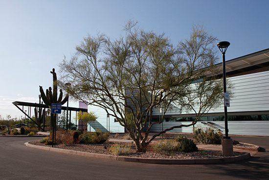 This Scottsdale library branch is located on 3.9 acres in an area of natural Sonoran Desert largely undisturbed by previous uses. GBtwo worked closely with the design team to integrate a large parking lot and other site elements into the natural grade, to incorporate alternative hardscape materials that blend the architecture into the native desert, and to restore Sonoran vegetation by transplanting over 40 trees and cacti salvaged from the site. An entry bridge at the building entrance spans a recreated natural water harvesting arroyo, a perfect pedestrian transition from exterior to interior spaces. The project received LEED-Gold certification.