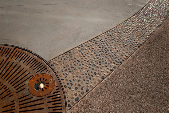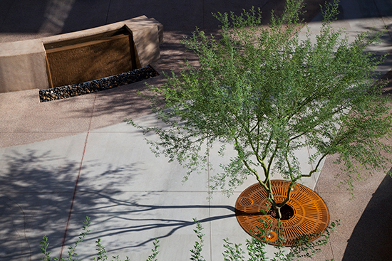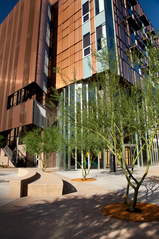 At this newly constructed addition to the downtown Phoenix Arizona State University campus, restful organic landscape forms break through the busy urban grid, creating a restorative outdoor space that is an integrated extension of building form and function. The streetscape creates a strong downtown campus edge. The multifunctional plaza areas can accommodate large groups. A small desert garden attracts hummingbirds and butterflies.