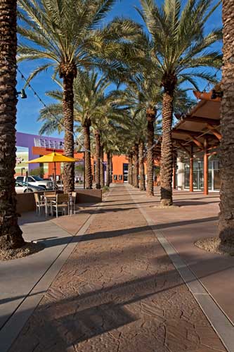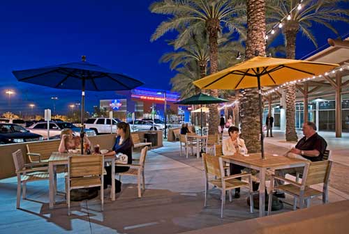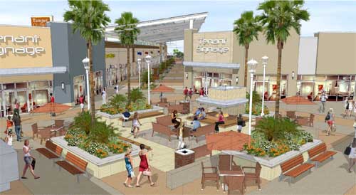 The Tanger Outlet project is an open-air concept shopping center, with emphasis placed on courtyards with ample amounts of vegetation to enhance the pedestrian experience. Amenities include large trellis structures for shade, misters, large fans, water features and outdoor fireplaces.