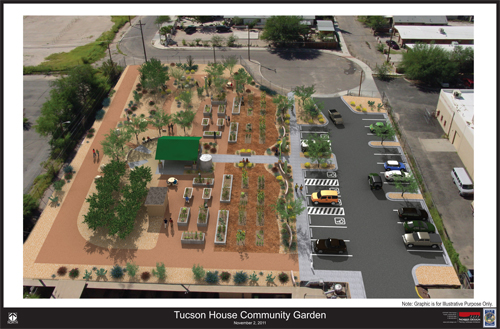 The Blue Moon Community Garden is the first fully-accessible community garden in Tucson. The site was an overflow parking lot for the Tucson House, a complex for over 600 low-income, disabled and elderly residents. The barrier-free design has 36 garden beds; 24 are raised at 16 or 30 inches, or at table-top height; 12 beds are at grade. The garden includes walking paths, a ramada for shade, tool shed, lockers, native vegetation, seating and game tables, an entry arbor and a citrus grove.