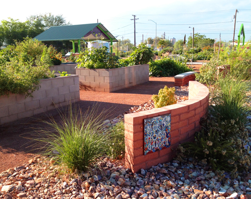 15,000-gallon rainwater-harvesting tank captures rainwater and A/C condensation from the 17-story adjacent building, providing water for the vegetables, plants and fruit trees. A smaller cistern captures water from the ramada for nearby landscape plants. The garden is now at capacity, flourishing in the desert.