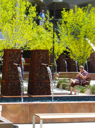 A significant renovation of the Scottsdale Centre office complex presented an opportunity to reintroduce landscape to the public spaces. The renovation of Scottsdale Centre was initiated to resolve drainage problems from several buildings and a plaza over a parking structure. The goal was to enhance visitor experience, provide a comfortable working environment and ultimately invite people to venture from the offices to the gardens and plazas. The team redesigned the spaces to create new social and private gathering spaces. The landscape defines the spaces and enhances the aesthetics of the property. The design increased the landscape areas, while significantly decreasing turf and water consumption. The design also improved wayfinding and pedestrian traffic.