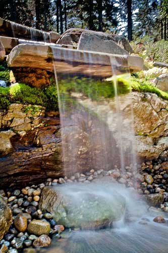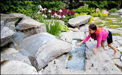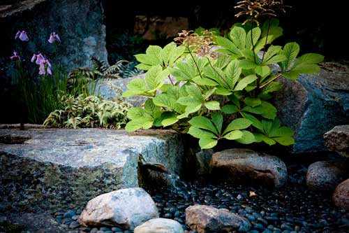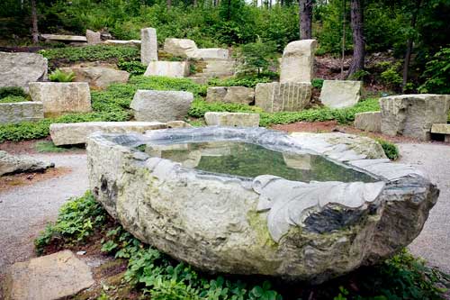 A natural-edged drilled boulder spills water gently onto a carved stone sluice, over a hand-forged bronze leaf into a pebble-lined basin. Photos by William S. Brehm