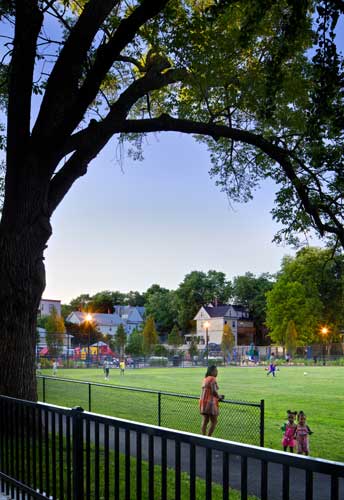 For more than 25 years CBA Landscape Architects has excelled at the design of public and private landscapes. Residential sites from city gardens to estates, public parks and playgrounds, library and museum grounds and commercial developments are all integral components of CBA's portfolio. The firm's work is highly contextual, generating richly detailed compositions that have been published in Landscape Architect and Specifier News, Landscape Architecture Magazine, Garden Design and numerous regional publications. The firm has two principals and four designers. Dr. Loesch Family Park, Codman Square, Dorchester, Mass. Dr. Loesch Family Park was first established in 1899 as an open city block ringed by mature trees. While always a focus of community life, the park developed into a dilapidated hangout for illegal activity. To transform the space, CBA worked with community input to create a design that best responded to the neighborhood's interests and budget. Boston Mayor Menino calls the new park "an oasis in the city." State-of-the-art lighting, a new basketball court, play equipment and seating brought new life and pleasant spaces to the park. Photos: Ed Wonsek