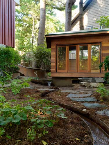 Julie Moir Messervy Design Studio (JMMDS) comprises three landscape architects, one designer, a marketing and communications manager and principal Julie Moir Messervy. JMMDS's landscapes include parks and arboretums, museums, cemeteries, academic/corporate campuses, children's gardens, as well as scores of residential clients. The JMMDS team creates conceptual and schematic designs and oversees all installation and planting details. The Toronto Music Garden, Toronto, Ontario JMMDS designed the Toronto Music Garden, with cellist Yo-Yo Ma as a creative collaborator. The design of this award-winning three-acre public park on Toronto's Harborfront was inspired by the "First Suite for Unaccompanied Cello" by Johann Sebastian Bach. Curving paths move visitors through six garden "movements." In 2005, the Toronto Music Garden received a Leonardo Da Vinci award for innovation and creativity. Woodland Modern, Dedham, Mass.