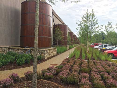 Sierra Nevada wanted to protect the beauty of the surrounding viewshed and look as though their brewery had always existed as a part of the surrounding natural landscape. Creating a landscape design that already looked mature and natural required the hardscape and landscaping phases to be pushed to an earlier part of the overall construction schedule. "We were putting driveways in while they were still framing the buildings," said landscape contractor Rob Atema of Rivertop Contracting, Inc. "It was a logistical challenge, but we got it done. We had delay after delay, but Belgard stored the material until we were able to work." Atema's crews worked weekends to make up the time. A blend of four different paver colors were used in the design: Ardennes gray, slate, Westerwood blend, and limestone, which was used for the majority of the project due to its SRI index and ability to reduce the possibility of creating a heat island effect, which could otherwise increase the temperature of runoff and potentially harm the ecosystem.