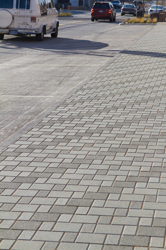 New design elements included adding ''rumble strips'' to the road to make drivers slow down in pedestrian areas. Pavestone's Classic Split 80mm 4x8 pavers, a split-face concrete paver for non-pedestrian applications, were installed, as the textural difference provids a warning for drivers. Laid in the preferred traffic lane herringbone pattern, the pavers give the look of a ??????? to ????? inch mortar joint. Standard finish pavers completed the four-foot wide pedestrian portion of the crosswalks.