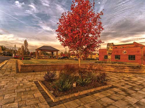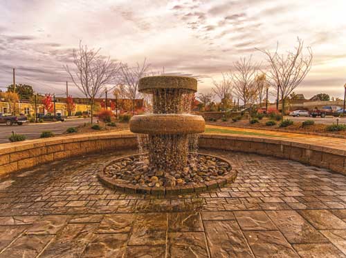 Southern Exposure's proposal was accepted in 2012, and the company spent the next few months drafting and finalizing the design, choosing materials and other tasks. "The goal was to take a large empty parking lot in the heart of the downtown and turn it into the new epicenter of commerce and entertainment," Goad said. Designing the complex wasn't easy, because community leaders had their own ideas of what they wanted incorporated into the project. They asked for a memorial for veterans, a Christmas Tree Square, farmer's market, community garden, water features, a large bandstand for live music, and walkways to tie all these elements together, even an outdoor classroom. Work began in June 2013, and the entire project was completed in two phases. Excavation and grading of the site was first. Spots designated for walkways, walls and patios were prepped, or dug out. Next came the installation of a base material, which was heavily compacted, followed by the layering of concrete sand to prepare for the pavers. The walkways and patios were created using Belgard Lafitt Rustic Slab in Avondale for the field. Avondale is a specialty color Belgard created for the project. The borders are Belgard Lafitt pavers in Belgian Stone. For borders along bed lines, the design firm used Versaloc curbing in chestnut. Retaining walls and seatwalls were all constructed with Rockwood Classic 8 straight face in brown.