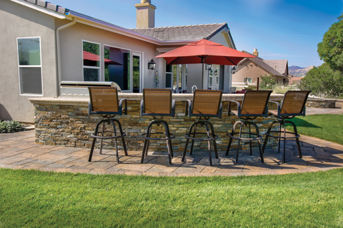 The installation spanned a wide range of projects, including a fire pit, barbecue, pool deck, pool coping, paved patio and paved front walkway. Lafitt rustic slab pavers bordered with Bergerac pavers were used on the pool deck, backyard patio and front walkway. The walls, including a perimeter wall and two seating walls around the patio area, create a natural sense of enclosure with Weston wall stones. The design team chose "Toscana" and "Bella" colors for the pavers, as they complemented the color scheme of the rest of the property. This custom designed combination of paver styles and colors was created to best fit the overall aesthetic of the home. The total area of the pavers spans approximately 3,400 square feet, which includes the backyard patio, pool deck and front walkway. The installed amenities create an outdoor living space complete with a fire pit and barbecue. For these additional installations, the Go Pavers team used the same paver types used for the backyard, pool patio and front walkway installations. This creates aesthetic continuity, better integrating permanent pavers amenities into the outdoor living space. The 110 linear feet of pool coping was done with Mega Bergerac pavers. For the fire pit and barbecue they used Weston wall blocks. The front yard pilasters were done with veneer stone and caps.