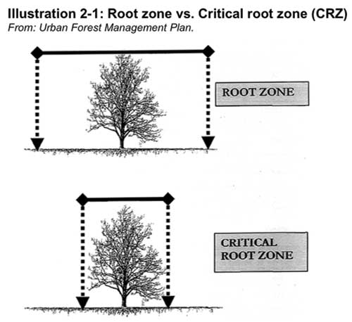 Tree protection standards to be followed during construction are specific. They include preparation of a Tree Protection Plan, primarily for the protection of critical root zones during construction. The plan must consist of tree fencing locations; fence construction details; standard tree protection specifications (listed in sec. 2.3.2); and tree protection symbols (as illustrated in 2.2 of the manual).