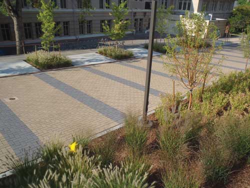 "The success of the first phase resulted in an extension of the use of the pavers in this new area," said project designer Mathew Evans, RLA, ASLA, LEED AP, Lime Green Design. "An unanticipated second phase of the project led to the "pedestrianization' of another section of street. As part of the master plan, a preliminary study identified another two blocks of city street extending out from the original Brown Hall project which will eventually be vacated, and the plan currently shows the continued use of permeable pavers in this new pedestrian spine." The campus paving needed to be practical and beautiful. Designer Evans, architect Anderson Mason Dale, installer JC Coniff, Rocky Mountain Hardscapes, LLP, civil engineer S.A. Miro, and the Colorado School of Mining's planning, construction and facilities management teams agreed to the selection and installation of 35,000 square feet of Eco-Priora• permeable pavers, manufactured by Pavestone, LLC. Design and Construction Challenges In addition to pedestrian traffic, the paving had to support the weight of fire trucks, service vehicles and the occasional 18-wheeler. With an average annual snowfall of over five feet, the pavement also had to be durable enough to sustain regular snow plowing. The construction schedule was also dictated by the school year.