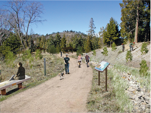 Once complete, there will be well over four miles of hiking trails integrated within the park. Bioswales will be created to mitigate the many drainage issues throughout the site. Boulders and rock, which are prevalent on the site, will be used to construct the network of bioswales. Revegetation of the hillsides caused by the initial site grading will be a primary goal for the renovation efforts. Grading scars will be mitigated by planting indigenous trees, such as Coulter, Jeffery and sugar pines, in conjunction with native shrubs, grasses and ground covers. Many of the native pines will be provided by local United States Forest Service outlets. Large all-purpose activity play areas will be created by filling in low areas and backfilling sediment basins, which were originally constructed for the housing project but are no longer needed.