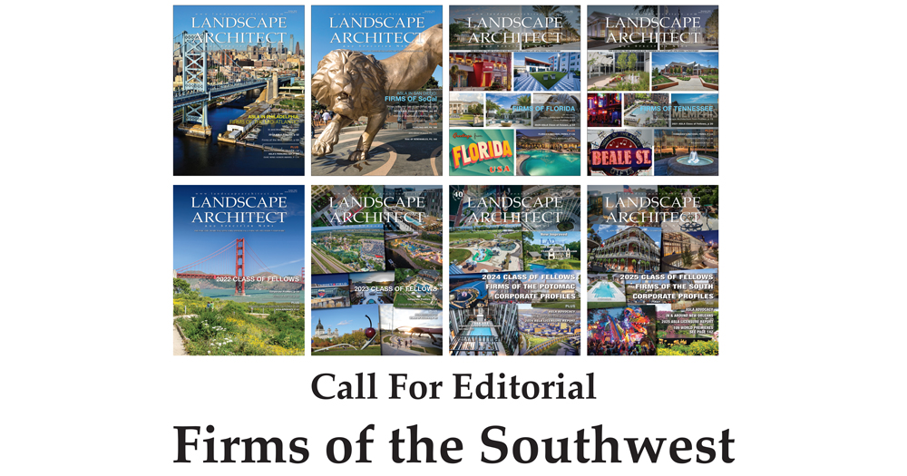 In anticipation of the 2026 ASLA Conference on Landscape Architecture hosted in Los Angeles, California, LASN's August 2026 Issue will feature landscape architecture firms located in New Mexico, Arizona, and Southern California (anywhere in or south of San Luis Obispo, Kern, and San Bernadino counties).