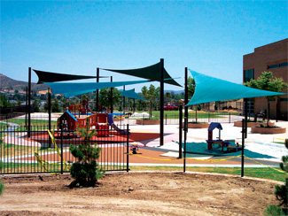 At Samueli Jewish Campus in Irvine, Calif., the shades provide protection around the play equipment. The free-form style made of varying shapes and sizes provide areas of shade without interfering with the playground equipment and their associated fall zones. Because there are no large obtrusive structural elements they have a playful airy look that adds to the ambiance.