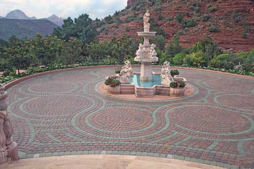 A beautiful home deserves an equally beautiful entrance. The owner, designer and contractor of this Sedona project designed and created a stunning driveway that welcomes visitors to this grand home, situated on a hill with a magnificent view of the nearby Chapel of the Holy Cross. This complex job is a testimony to what can be achieved with a vivid imagination, exceptional CAD skills and interlocking pavers.