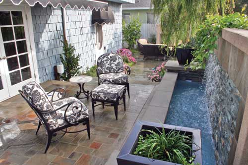 Challenges The project’s main challenge was the yard’s long depth and narrow width. To overcome this challenge, steps were added leading up to and down from the patio area located adjacent to the water feature. According to the contractor, “Elevation changes, such as these, add character to a landscape, while also helping to break up the space.” To clear more space, the contractor removed an old vine that was growing on the back wall.