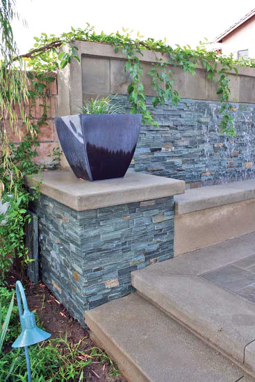 The Water Feature The project’s centerpiece is the three-foot wide x 12-foot long, custom water feature made of slate stack stone and concrete. The fountain was plumbed exactly like a pool with a plaster basin, waterline tile, skimmer, filter and underwater lighting to keep it sparkling and free from debris. The water feature boasts a dramatic jagged ledgestone rock face that generates a soothing and relaxing sound as the water trickles over it.