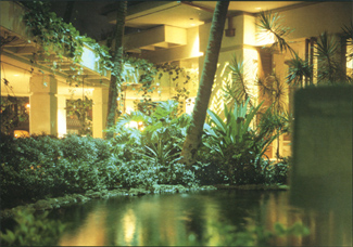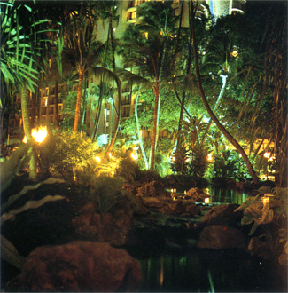 Watson personally designed the fixture plan for the hotel, at a cost of less than $150,000. The Hilton property posed a series of challenges for the seasoned landscape illuminator. A pond near the commodious front desk was the natural habitat for rare red winged flamingos. The hotel horticulturist was insistent on not disturbing the sleeping habits of the birds. This meant that no extraneous light could be used on the pond.