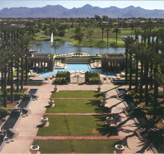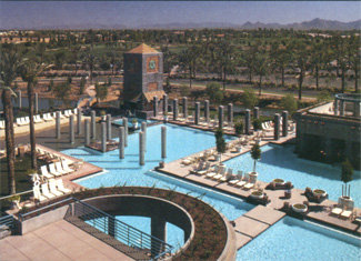 The 486-room Hyatt Regency Scottsdale at Gainey Ranch is a resort hotel with 20,000 square feet of swimming pools in separate pools, 28 fountains, 47 waterfalls, a water slide and a beach.