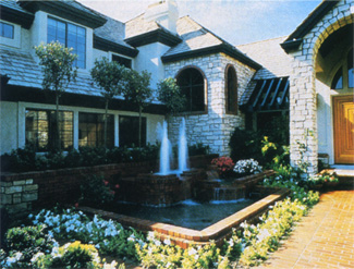 Fountains, swimming pool and spa were integrated early on in the design scheme. At the front entry, a tiered fountain with water cascading over brick weirs was designed to infuse immediate drama and a sense of elegance to welcome visitors. Travertine marble was used in the front entry and continues through the home to the rear, terminating at the pool deck. There, the swimming pool becomes visual and physical focal point of the rear yard.