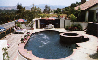 The entertainment area is highlighted by an outdoor cook center which includes a gas range, a gas barbeque, sink and refrigerator. Hidden from view, in back and below the elevation of the outdoor cook center is a combination shower and dressing room. Electrical outlets, gas quick-couplers and stereo speakers are in easy access as are telephone jacks and television antenna cable connections. Sensitivity and attention to detail is evident throughout the project.