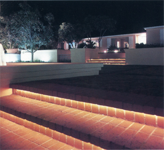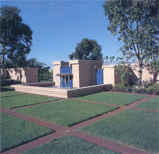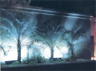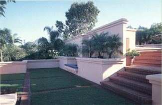 Warm coral-toned stucco, tropical plantings of hibiscus gardenia and palms, and the shimmering sound of cascading water over the indigo tile all invite one to celebrate the climate and bring the party outside. Drainage is provided through the brick bandings into a trough below while the irrigation heads are designed right into the banding itself. In addition all the fountain equipment is in a separate room actually underneath the reservoir of pools.