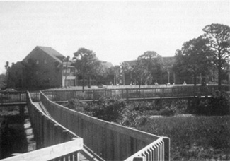 The second objective of the plan – providing amenity for non-gulf-front units – was accomplished in three ways. First, the siting of “patio homes” landward of the villas/townhouses by the Landscape Architect was done to create informal clusters of units among the mature pines and live oaks only after thorough vegetative studies. These trees helped tremendously to give the project ambience and prevent both a boring linear arrangement and that “just built” look. Second, free and easy access was provided to the gulf-front amenity package?EUR??,,????'????EUR??,,????'???the swimming pool and cabana, picnic area, gazebo and an extensive strolling path and boardwalk at the water edge. Third, adjoining development both north and south of this area was buffered and the road to the gulf-front area was substantially depressed to minimize its adverse impact.