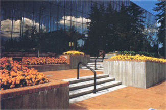 The largest of these is a 120×330 foot multi-level courtyard featuring raised planters, seating areas, and brick paving. The brick pavers are 6×12 units set in sand with cast-in-place concrete walls and steps as the containment. The planter walls are board-formed concrete with a ’ brick cap to match the paving. Handicapped ramps are provided between each level and from the adjacent parking. ’~