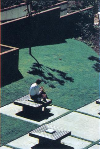 Major features of the largest courtyard are seating alcoves set apart from the traffic flow and a special fountain terrace area located near a group of existing trees. This terrace is the primary area for those who wish to lounge or eat lunch in a “garden setting”. A 10 foot square fountain is the focus of this terrace.