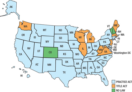 The ASLA?EUR??,,????'???s targets are Colorado, Vermont, New Hampshire (no licensure), and those states with title acts only (see map). States that have fairly recently made the jump to practice acts are Idaho, Iowa, Mississippi, Missouri, Ohio, Oregon and Texas.