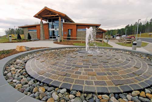 Hardscape Harmony The site design, material durability, regional/rural culture/characteristics and the defined building architecture were considerations in selecting appropriate materials for walkways and the water feature. Kopetsky notes, ?EUR??,,????'??The Pavestone Adirondack pavers in Old Town Blend were used at varying points along the walkways, courtyards, and exterior foyers. The use of the paver was to subtly highlight intersecting points or areas of interest throughout the site. They were used as a ?EUR??,,????'??placemat?EUR??,,????'??? of entry to the site. The color and texture of the paver was defined to compliment the architecture and regional character. We have had experience in using textured concrete, but we find that pavers offer greater variations of texture, color, and design while offering durability and simplifying future maintenance since we have a great number of subsurface utilities and drainage that often need unplanned accessibility. The ease of paver installation also minimizes our need for construction oversight and guarantees a good finished product.?EUR??,,????'??