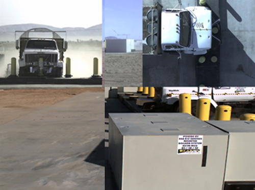 On January 18, 2012, this surface-mount bollard system passed a DOS K12 (ASTM M50 P1) crash test. This means a 15,000-lb. truck traveling at 50 mph struck a bollard head-on and was stopped dead in its tracks, i.e., the front tires did not breach the bollards, and the truck's front end was obliterated. The reason it struck only one bollard is the space between the bollards was four feet. The K12 indicates the level of anti-ram protection used at U.S. Embassies and Consulates around the world.