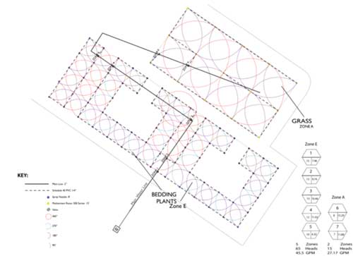 Irrigation Regulations Central to that management is having local landscape regulations that guide the grower, designer and irrigation contractor in the proper use of irrigation system components as manufactured by leading irrigation companies such as Toro, Rainbird, Hunter and others. Well-written regulations provide guidelines that insure the landscape industry sees potable water supplies as a limited resource not to be wasted by inefficient design and poor installation practices. EPA intervention and dwindling water supplies in the West are leading to new best practices in the design of irrigation systems. These new practices are finding their way into regulatory form. Take for instance the statewide irrigation code for California, AB 1881. It amends Chapter 559, California Civil Code that resulted in Title 23. Waters, Division 2, Chapter 2.7. Model Water Efficient Landscape Ordinance (MWELO). The 33-page ordinance whose purpose is to "establish a structure for planning, designing, installing, maintaining and managing water efficient landscapes in new construction and rehabilitated projects," has been adopted in every community statewide. This state law provides guidelines for standards for use of green irrigation equipment, design by hydrozones (Fig. 2, designed by Lindsey Folse), based upon plant water needs, as well as the preparation of irrigation plans and landscape documentation packages. Irrigation plans (Fig. 3, designed by Lauren Patti) must be in conformance to specific evapotranspiration rates, water and budget calculations. California provides a water budget calculator to assist the landscape architect in the completion of a water efficient landscape worksheet www.water.ca.gov/wateruseefficiency/landscapeordinance. Results are computed as estimated total water use (ETWU) in gallons, cubic feet and acre-feet per year. This is all that can be used each year. This calculation is adjusted for landscapes of various regions. Landscapes less than 2,500 square feet are exempt. A sustainable irrigation design provides many environmental services. The primary purpose of green irrigation is to reduce the use and waste of potable water; secondly, replace it with available recycled storm water and other harvested grey water using state of the art environment sensing irrigation equipment. Editor's note: You can contact LASN's associate editor Prof. Buck Abbey via email at lsugreenlaws@aol.com, or by calling the Robert Reich School of Landscape Architecture at 225.578.1434.