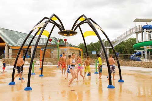 Superlative Splashpad Blue Heron Bay at Independence Lake County Park in Michigan is the largest splash pad complex in North America, covering more than 20,000 square feet. It took two years and cost $4 million to complete, replacing a previous splash park that was struggling after 12 summers of operation. The new project involved building the spray space in a more centrally located area in the 414-acre park, improving access for visitors. The park implemented some of the most advanced technology in sustainable water usage, including the water distribution system, nozzles, spray sequences, flow controllers and intervals of usage.