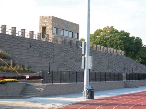 Bleacher walls were built up before pavers were installed on the seat rows to avoid damage to the pavers during wall construction. Standard cap units were used for seating. The center of the bleachers is the high point, so water drains in either direction.