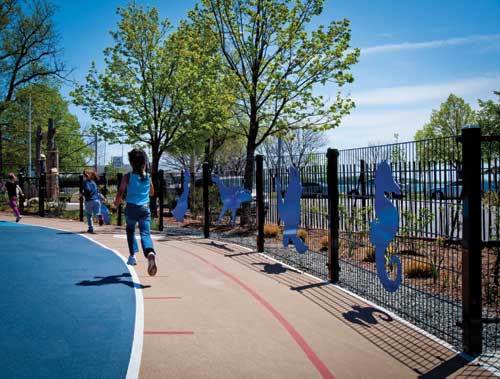 The rubberized track, a 300-ft. circumference, has incremental markings painted every 10 feet. Five artistic cutouts of sea creatures are mounted to the 4-ft. welded metal fence (Omega II).