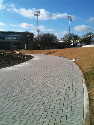 Pedestrian Access The east side access and loop drive to the stadium provided the pedestrian link from the main campus across Interstate 35-E, additional fire and emergency vehicle egress, and access for pregame event set up. CCA utilized permeable pavers in this area for continuity of material in addition to control storm water impact to an existing greenbelt drainage field and residential adjacency. CCA, working with HKS, created a “promenade” on the south edge of the stadium for combined pedestrian/vehicular access using Pavestone’s Holland Stone interlocking concrete pavers in pewter and cast stone colors.
