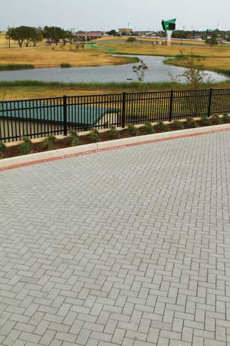 The Paver Solution According to Lindsey White of Caye Cook & Associates Landscape Architects, the pavers solved a lot of issues in terms of water quality that would not have been addressed if concrete had been poured. Concrete would have created a vehicular roadway feel to the major entries, while the pavers give more of a sense of pedestrian use.