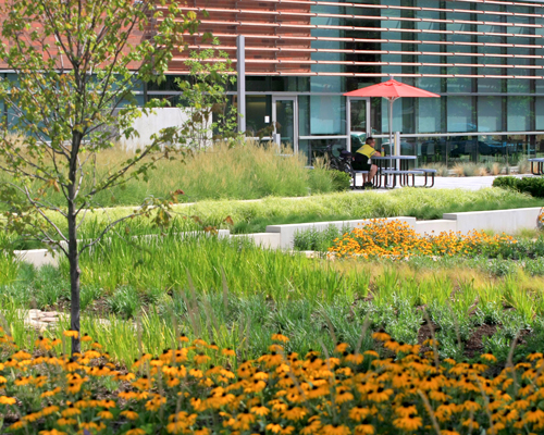 NBBJ is a multidisciplinary design practice named among the top 10 most innovative design firms by Fast Company two years in a row. NBBJ has partnered with Google, Alibaba, Amazon, Samsung, Microsoft and Tencent. The client list also includes Cambridge University, the Cleveland Clinic, Massachusetts General Hospital, Ohio State University and Stanford University. NBBJ's Landscape Architecture practice is centered in the firm's Columbus, Ohio (Ed Mickelson, FASLA, principal), and in Shanghai, China offices. NBBJ approaches landscape design as an opportunity to make connections between people and nature, between indoors and outdoors, between old and new. NBBJ says it works with clients in the U.S. and around the world ''to design high performance landscapes that are culturally relevant, sustainable and provocative.'' Riverside Methodist Hospital Neuroscience Center, Columbus, Ohio In conjunction with the design of this highly visible patient tower, a large portion of the Riverside campus is also undergoing a significant transformation. The site design addresses parking, wayfinding, stormwater management, lighting and vehicular circulation. The new courtyard at the tower's third level will provide natural light to patient rooms and hospital corridors, along with calming landscape views. The bold yet simple landscape design transforms a chaotic and confusing arrival experience into one that is calming and clear.