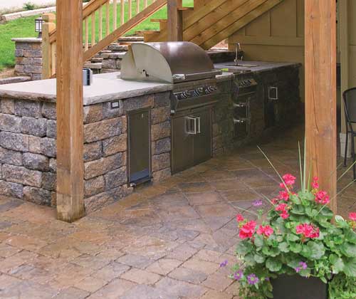 In October of 2010, the real work began. The Pinkepank’s railroad tie wall was replaced with a 9-foot retaining wall of Pavestone’s Anchor™ Highland Stone. The Pinkepanks were so pleased with the results that they elected to replace their concrete patio with a 1,000 sq. ft. paver patio, and draw plans to add an outdoor fireplace, 18-inch sitting walls and an outdoor kitchen with a FireMagic grill. The Venetian Stone™ patio complemented the retaining wall and completely refreshed a previously unremarkable outdoor living area, while the Anchor™ Highland Stone sitting walls created even more usable space.