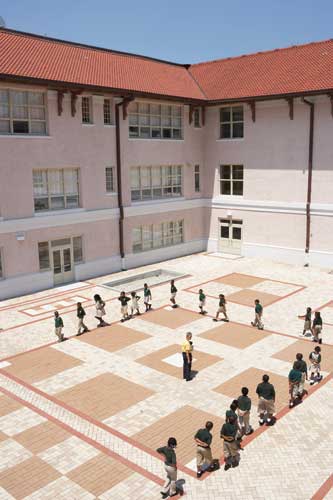 HMS Architects principal Charles Montgomery, AIA, ASLA, said, '?N????e??we evaluated how we could define the space for various activities for elementary students, such as checkers and various games, then decided that the interlocking pavers were a better choice for designing patterns into the courtyard. The design team felt it needed to activate the space by giving it some patterns so it did not seem so monumental. It is attractive to look at when empty, but when the kids are playing on it the courtyard comes alive.'?N????e??