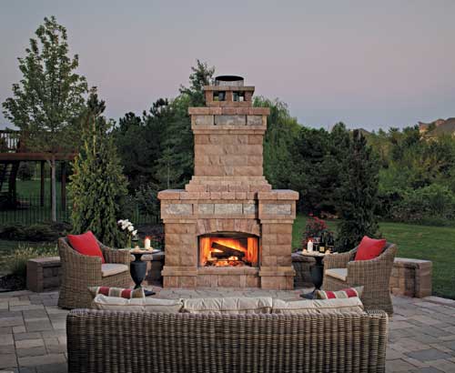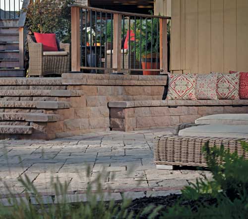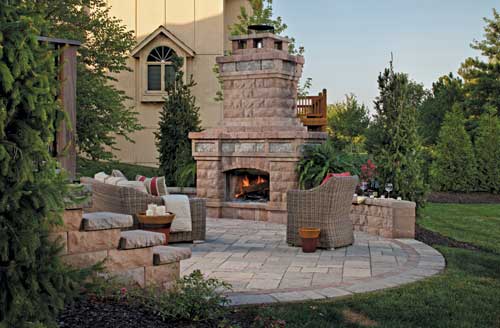 Picking Packs of Pavers With the design elements in place, the team moved on to surfacing, step and wall block selections. "Our clients were torn between the look of Mega-Lafitt and Mega-Bergerac pavers," Welch said. "[The former] has a natural-looking texture resembling the look of cut flagstone, and [the latter] has a timeless, hand-cobbled appearance." The homeowners ultimately decided on their first option, leading workers to install a total of 600 square feet of surfacing in two color blends. The second stone choice was included as an accent border. Knowing that the homeowners wanted a fire feature in their outdoor space, Landworks recommended they consider a modular, prebuilt system that matched their paver selection. The Nottingham fireplace they selected features the same wall block selected for the seating walls and stairs. "Prebuilt modular hardscape elements make creating an outdoor living space easier and more affordable than ever," O'Neill said. "[These] elements are designed to coordinate with the pavers and wall block so they can be seamlessly integrated into the space."