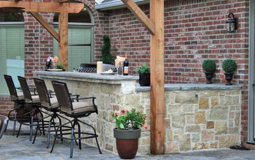 The homeowner chose a natural blue flagstone to cover the patio area, the coping for the fire-pit and the counter-tops on the outdoor kitchen. The exterior of the fire-pit and outdoor kitchen was veneered with a natural thin-stone that matched the stone on the homes existing exterior. A heavy duty Red Cedar Pergola was erected for shading and also housed a ceiling fan and outdoor lighting for nighttime use. In doing so all of the elements came together in a fashion that truly brought the indoors out and looked as if the home had been designed with the outdoor living area as part of the original design.