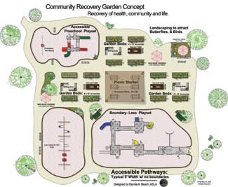 The article proposed a design called “Community Recovery Garden Concept—Recovery of Health, Community and Life.” This design was “outdoor places equipped with accessible paths that wind throughout, creating a network of dynamic interactive communal spaces for walkers, joggers, infants in strollers, bicycles, tricycles and wheelchairs. Places that are full of rich sensory sights, smells, sounds and full of life…to keep people coming back and spending more of their life outside reconnecting with people and nature.”